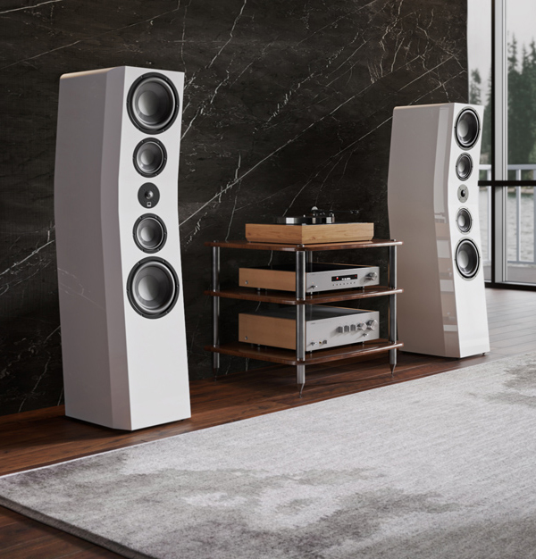 The midrange drivers have internal chambers acoustically tuned to eliminate cabinet resonances, while the cones of both the midrange drivers and woofers are made of glass fibre composite material. To minimize edge diffraction and provide better off-axis frequency response, the front baffles come built with chamfered edges. Additionally, the tweeter is protected from physical damage by an organic cell lattice diffuser.
