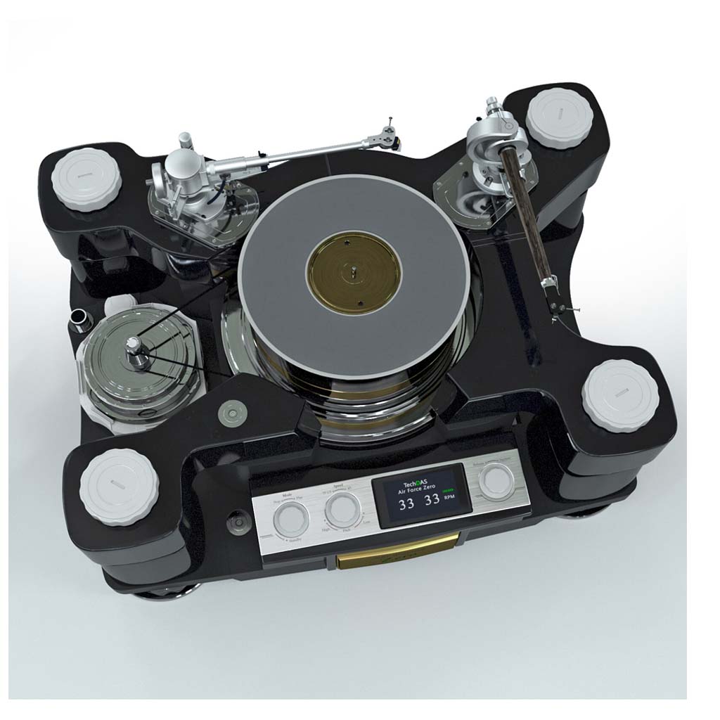 The Air Force Zero is TechDAS’s flagship turntable and a statement in analog playback engineering. Built with an ultra-massive multi-platter system totaling 100 kg and a stainless steel base frame of 100 kg, it achieves unmatched rotational stability with a moment of inertia of 16,000 kg/cm². A precision 3-phase, 12-pole synchronous motor by Papst drives the belt system, delivering high-torque startup and ultra-low-vibration steady rotation. Its air suspension system with dedicated power and air supply units ensures perfect isolation from external vibrations. With a total system weight exceeding 330 kg, the Air Force Zero represents the pinnacle of vinyl reproduction, combining cutting-edge materials, exacting tolerances, and timeless craftsmanship.