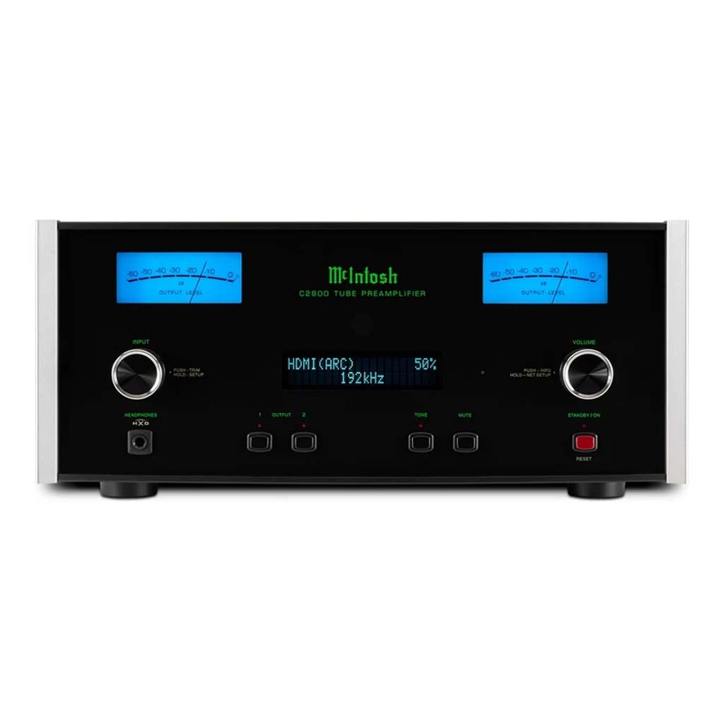 The McIntosh C2800 2-Channel Vacuum Tube Preamplifier is a state-of-the-art control center, blending classic tube warmth with modern digital prowess. It features four 12AX7a and three 12AT7 vacuum tubes in its analog signal path, delivering that signature rich McIntosh sound.