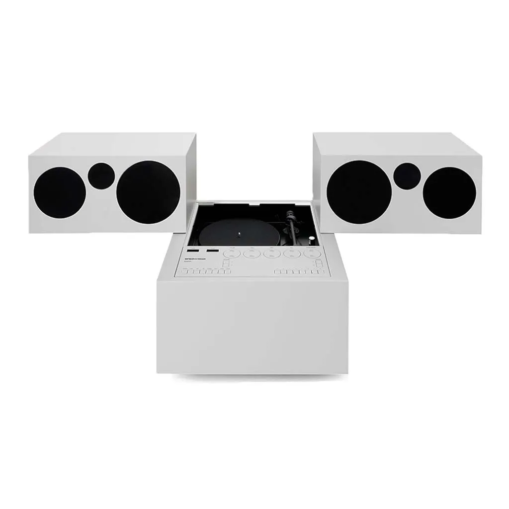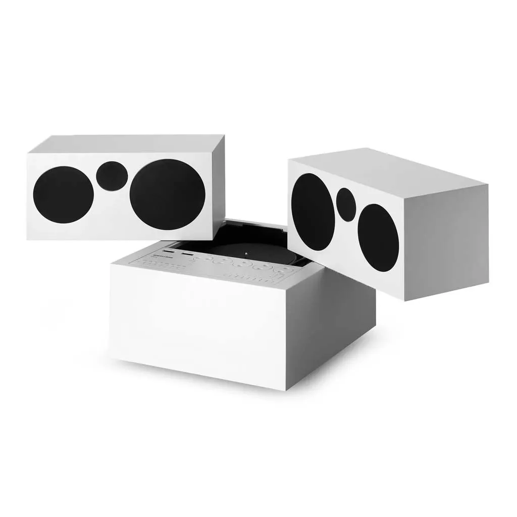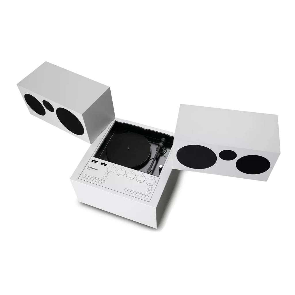 A simple white cuboid that opens up and is reconfigured in a sophisticated Hi-Fi listening machine with two speakers that open to reveal the stereo module, radio and turntable.